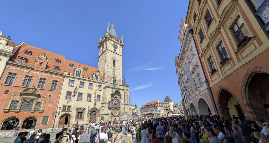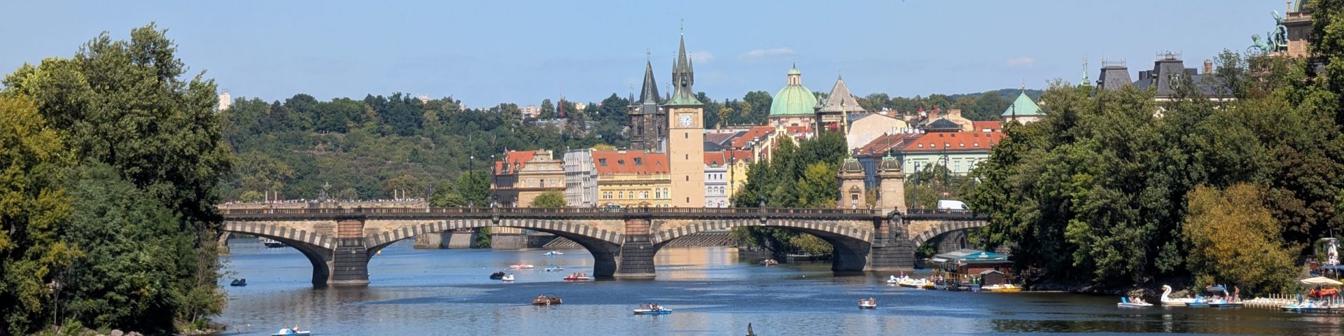 Goals for Prague: Get a general feel for the architecture, see some buildings, see some bridges, and wander in the general direction towards the outskirts in hope of finding a campsite before the evening. There was more to see than we could take in: we rumbled over the cobbles on fully loaded bicycles, and weaved through crowds, occasionally walking the bikes where the people pressed in tightly. We found a square with a clockwork chime and waited with other spectators until it struck one. We found a bridge, well, we found several bridges, and Dean began a photo-documentary which would last the whole way home.