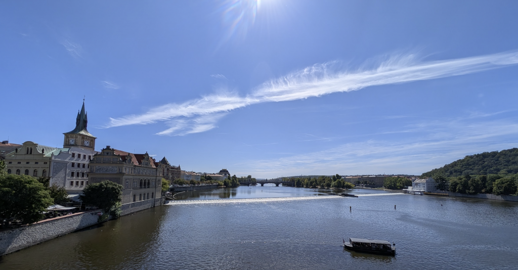 Praha hlavní nádraží, (Prague main railway station) was overwhelming. I wanted to enjoy the architecture, dwell on the iron and glass structure and soak in the size of the place, but I was simultaneously hyper-alert to pickpockets. I know that I need to be careful in crowds of tourists, because it is easy to become a victim by looking like a gormless target. So my cycle luggage was tied onto the frame, and the bar bag was locked. We left the building by the first exit we found, which led directly onto a car-park ramp, and after looping around in a lost way, ended up on a dusty corner between the car park entrance and the traffic filled dual carriageway. We pushed our bicycles under a railing and across a park to reach a path: to roads leading away from the station’s bustle. We were not, however, going to escape bustle. It is Prague. We found coffee and took stock: what should we do.