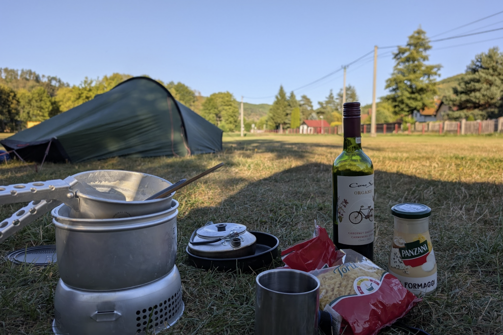 Dean has a lot of experience cycle camping, and one of his tricks is to call in at a Supermarket within the last 20km, picking up food for the evening. I had received a tutorial from my wife about cooking with the Trangia, and knew what I was looking for in the shops – pasta, sauces, rice, cooked meats, cheese; anything that I only needed to reheat and nothing that needed preparation.