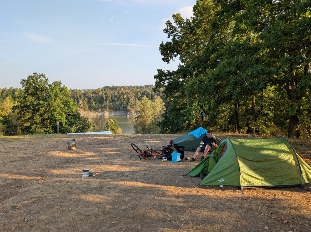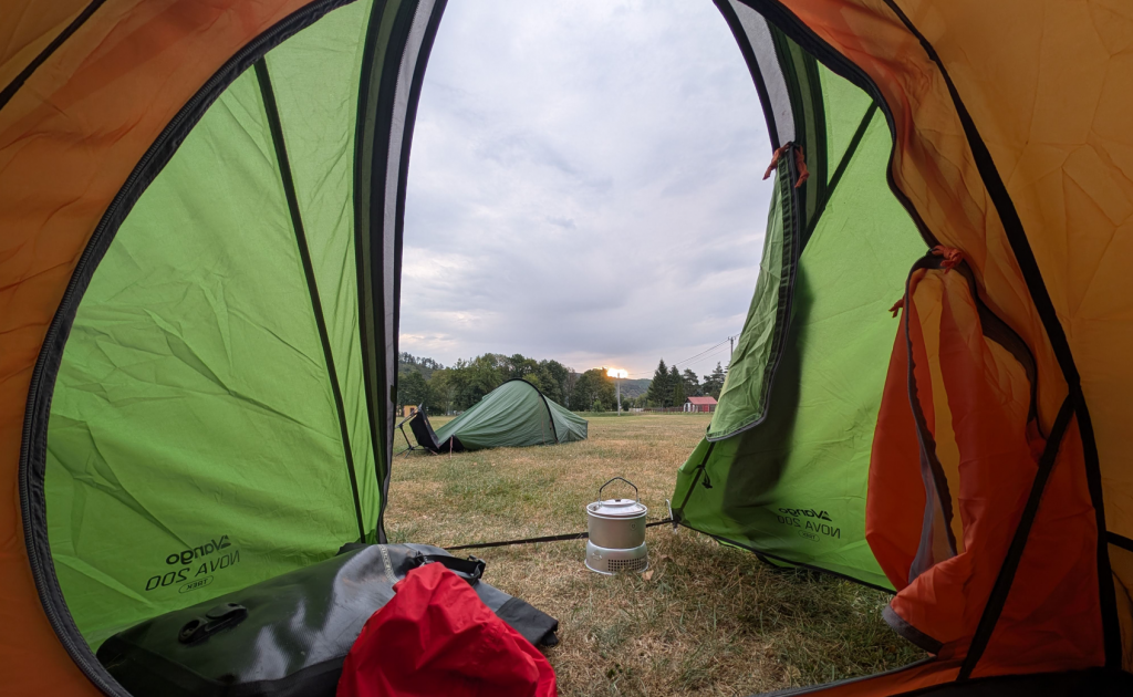 I was expecting a difficult night of sleeplessly trying to get comfortable. I was expecting to start the day feeling exhausted and with movement limited by pain in my joints. So I was surprised to discover I had slept well, and upon waking, moved easily through the tent. Good sleep wasn’t simply because I was tired from yesterday’s cycling, it was more that I had an excellent combination of inflatable mat, sleeping bag, and pillow. I think it was the recent addition of the pillow that made the biggest difference: I’d brought a puffy-jacket that packs into its own pocket and doubles as a camping pillow – this made it possible for me to sleep on my back instead of my side.