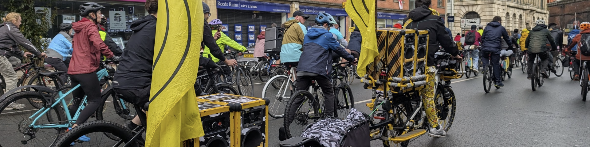 Dom has a trike fitted with his mixing desk, and live streams himself playing Drum & Bass tracks while riding. He is supported by mates on cargo bikes, pulling speaker stacks which relay the rolling party to the hundreds of people who come along for the music, the cycling, and probably for the chaos too.
