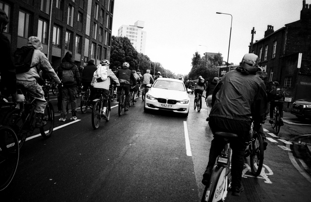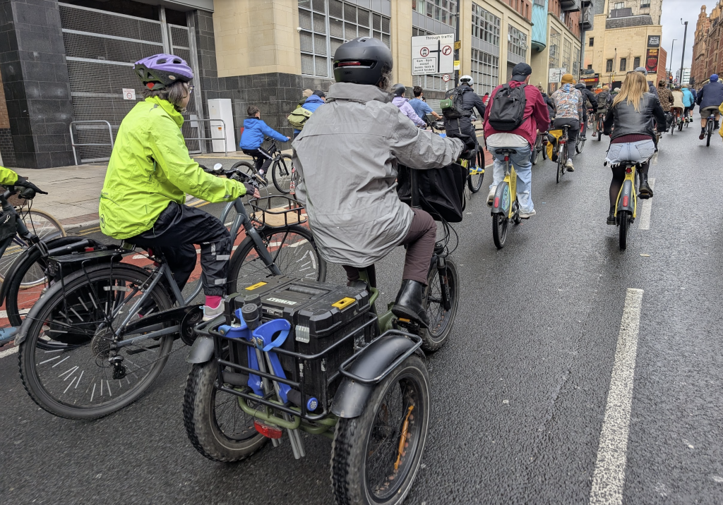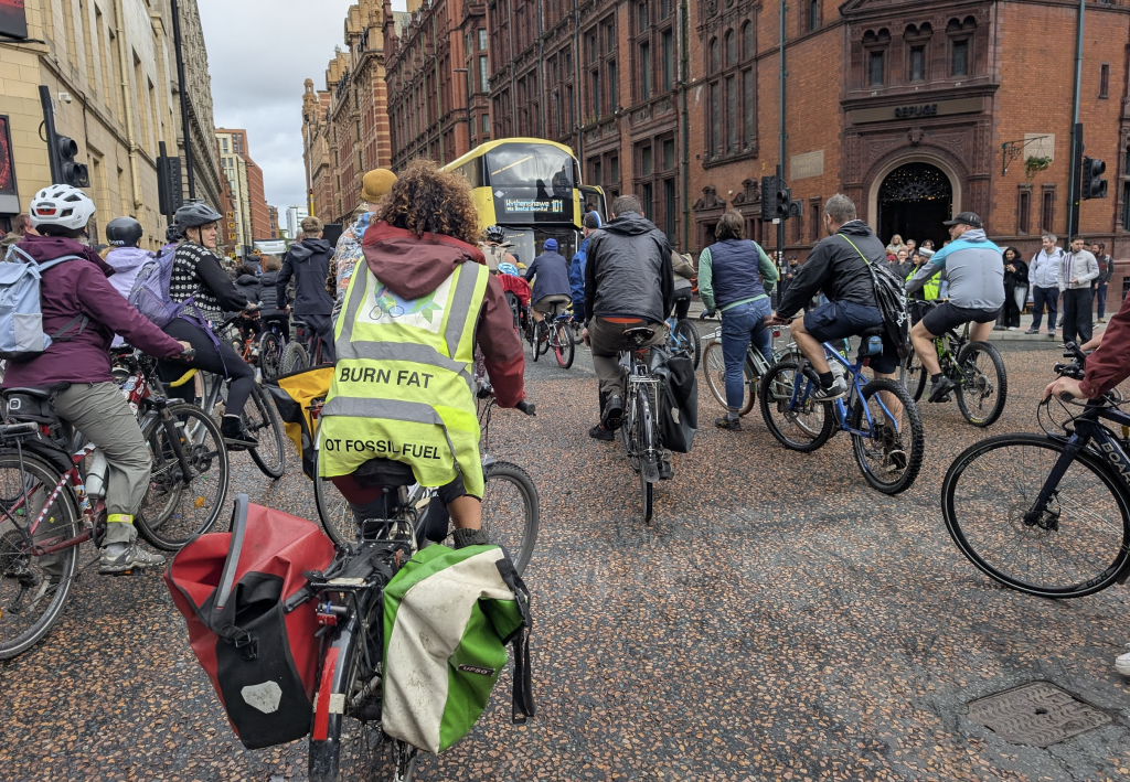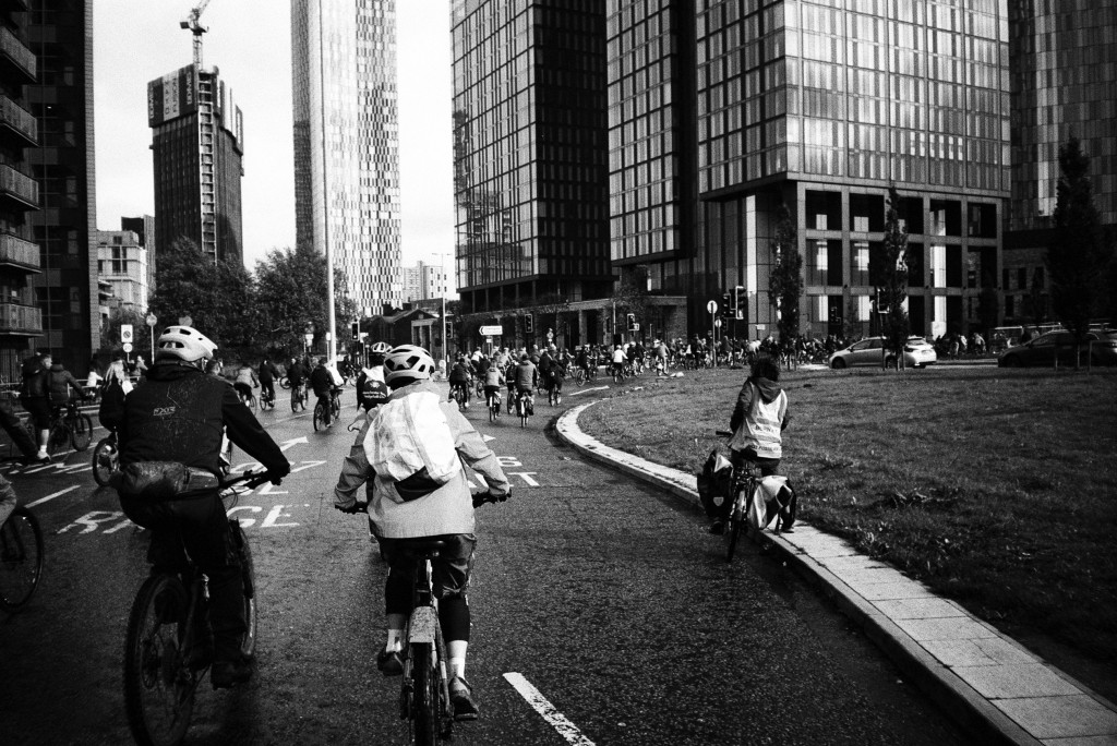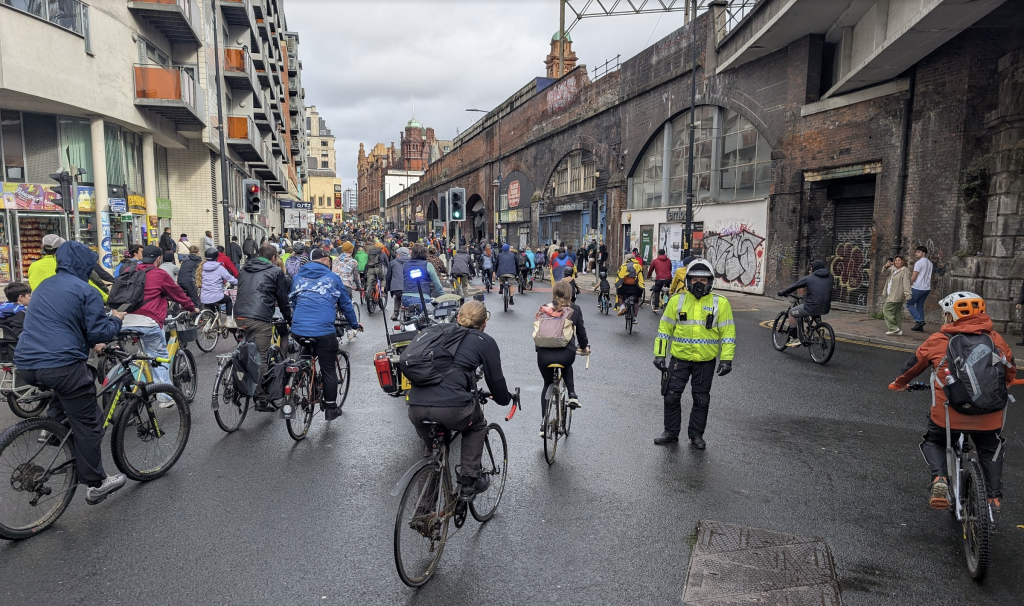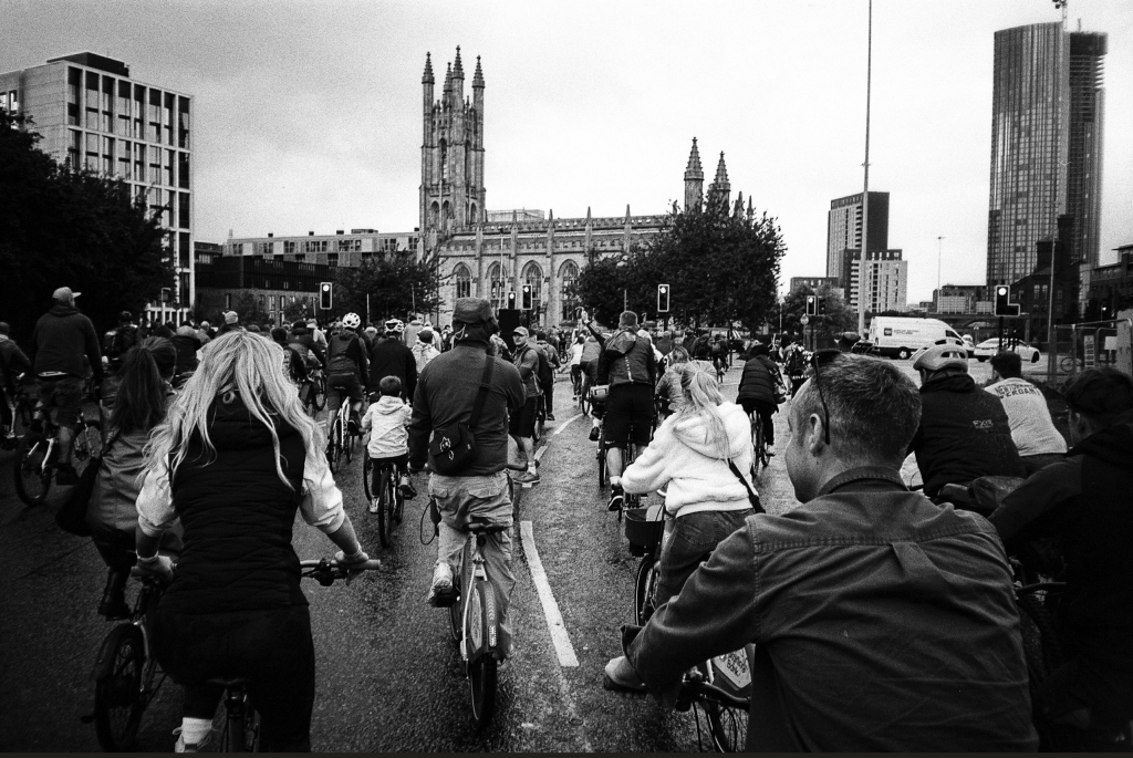 The music is loud, and as we cycle through Manchester crowds pour out of offices, shops, cafes and pubs to see what the fuss is about. Many grab a hire bike and join in… there are skaters, scooters, joggers and riders all bumping along together in good humour and without accident or incident. We take both sides of the road. Motorists in cars, buses and trucks give up, and sit still waiting for us to pass… anyone trying to push their way through gets stopped by police motorcyclists who are watching out for our safety.