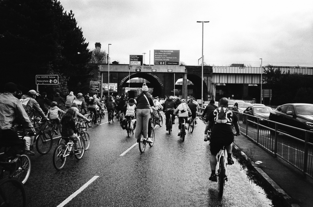 There was a planned route. We don’t follow it. We cycle along four lanes of a dual carriageway, turning off before the motorway junction. A massive roundabout is blocked for a while as we slowly ride around it, and as we pass under bridges and through tunnels the music echos and reverberates with additional energy.